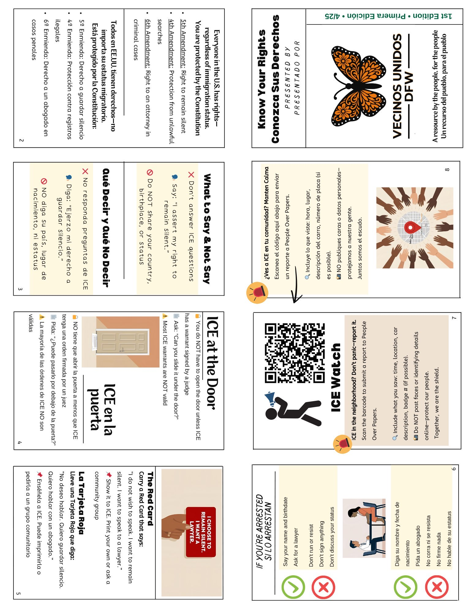 “Know Your Rights” zines aim to empower individuals by providing clear, concise information about their legal rights, often in a way that is easy to understand and share. The content can vary, but it often includes information about Constitutional rights, rights during interactions with law enforcement (e.g., questioning, searches, arrest), rights related to immigration status and rights in specific contexts, like protests or workplaces.