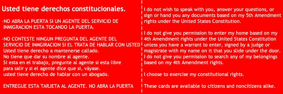 All people in the United States, regardless of immigration status, have certain rights and protections under the U.S. Constitution. The ILRC’s red cards give examples of how people can exercise these rights. However, they do not provide individualized legal advice.